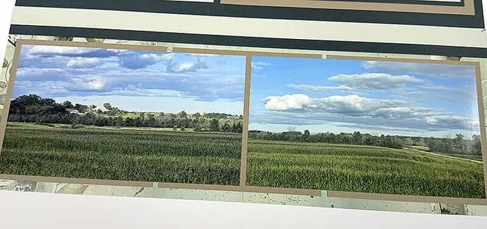 Crop two horizontal photos to span the space created by the three mats at the bottom of the page.