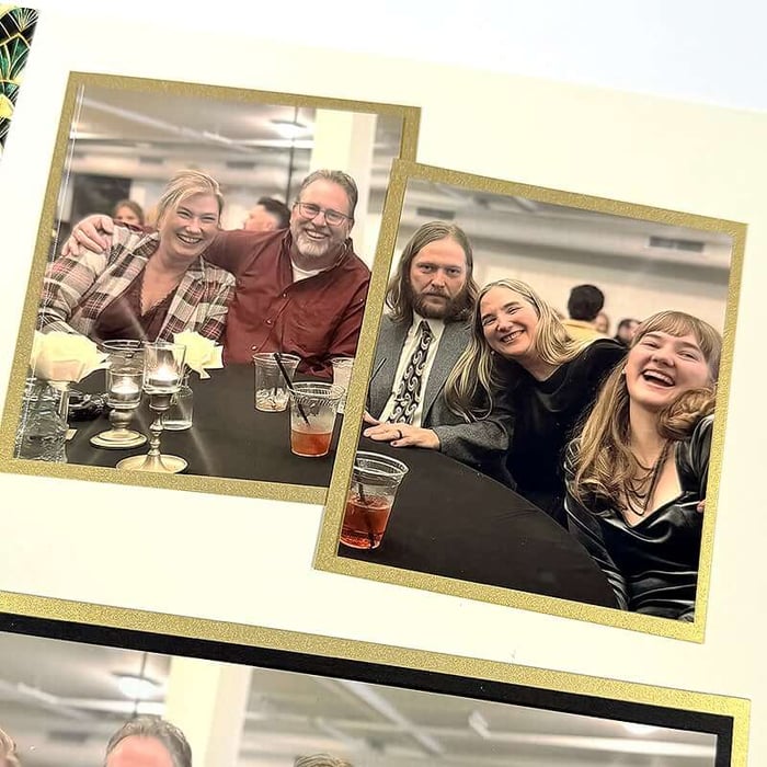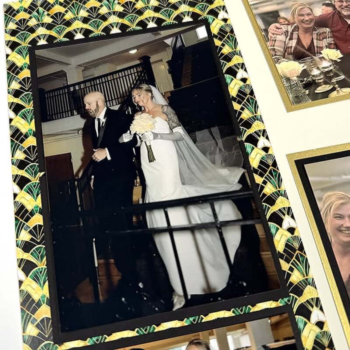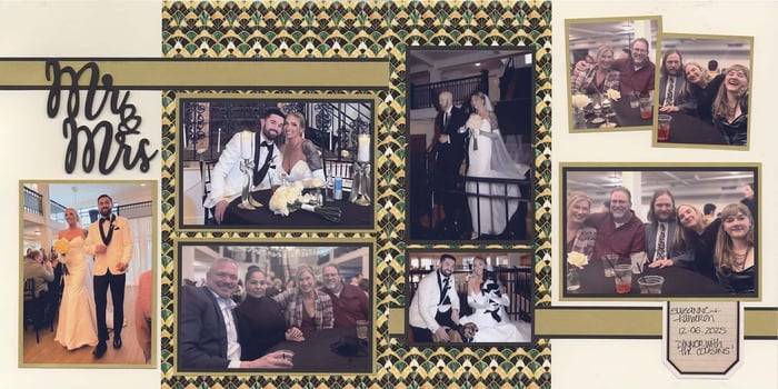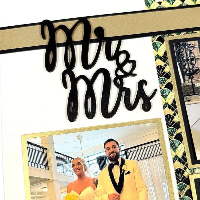 Once the trimmed elements are adhered to the base papers, it's time to add photos and embellishments. I removed the 3x4" Black mat from the left page to create space for the "Mr. & Mrs." woodcut.