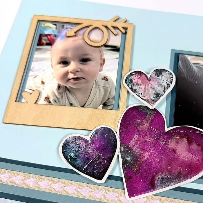 In lieu of the twin mats at the top of the right page, I used one to mat a small photo and topped it with a Heartstrings Frame Wood Cut. (Last year's Heartstrings woodcut is still available and it's a perfect match to this year's Heartfelt collection!) Add heart-shaped cutaparts with foam adhesive.