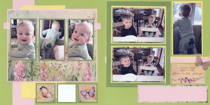 So much more than just a "sketch", the Cottage Garden Page Formula creates a well-balanced two-page spread from six coordinating 12x12 papers. This month's layout has space for at least eleven photos.