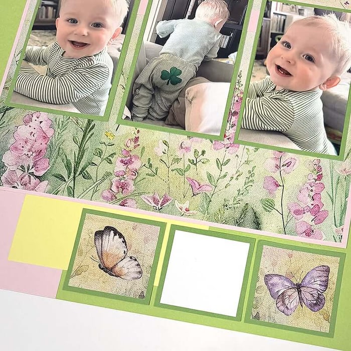I changed very little on the left side of the layout. In lieu of photos, I trimmed butterflies from the artwork on the Cottage Garden Card Cutaparts to fit the small square mats. I'll add journaling to the white square later on.