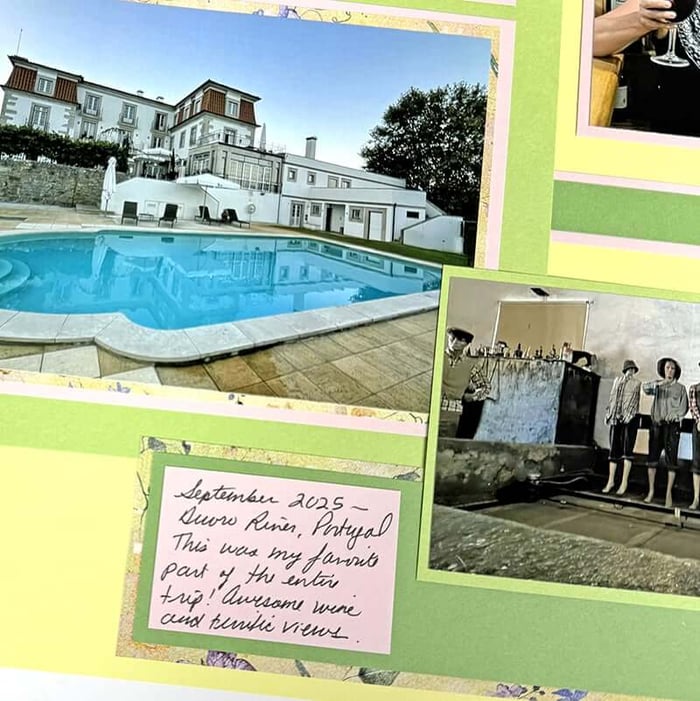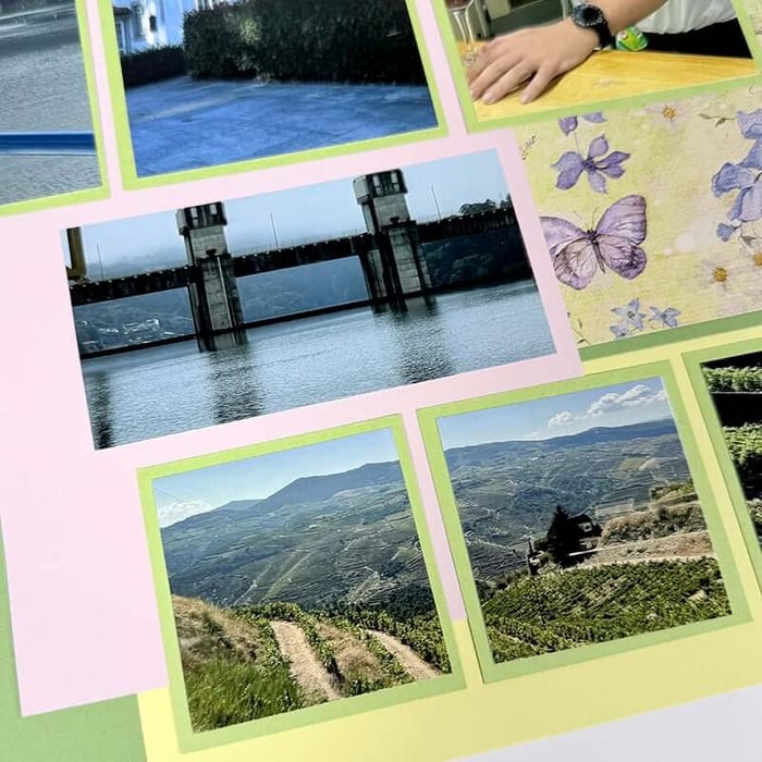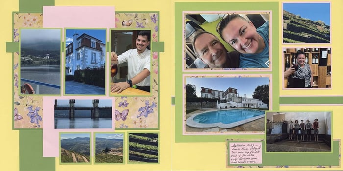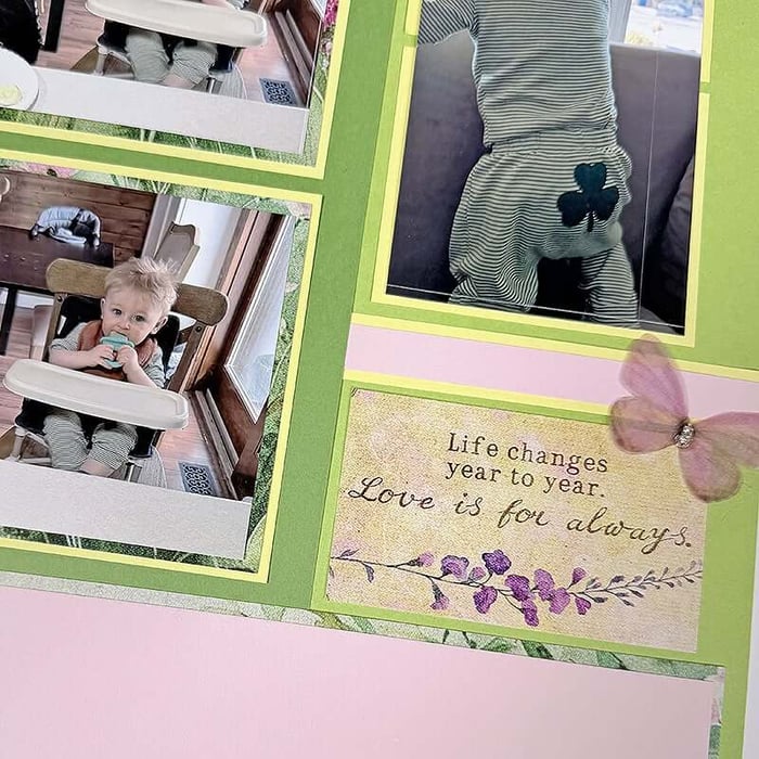Once the trimmed elements are adhered to the base papers, it's time to add photos and embellishments.