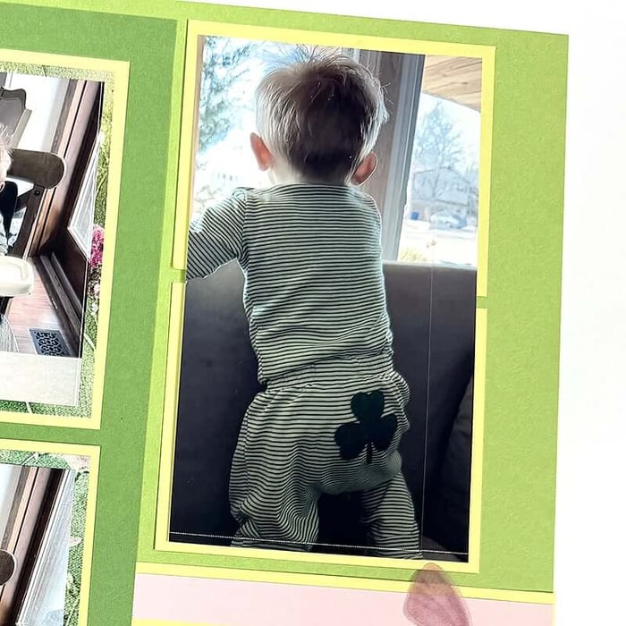On the right, crop a single photo to 3-1/4 x 5-7/8" to span the space created by the twin Yellow mini mats.