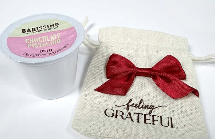 These sweet little pouches are the perfect size for a sachet of loose leaf tea, a few tea bags, a Keurig pod or a small handful of Starbucks Via packets. Adhere a Boughs of Joy Satin Bow to the front of the bag and you're ready to go!
