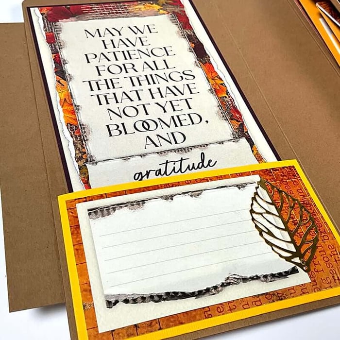 Nest the 4x6 journaling cutapart onto a 4.25x6.25" Kraft Folding Board (cut from scraps). Center onto the front of the book, adhering to the left flap only. I really liked the size and sentiment on the cutapart, but I had to resolve the journaling box issue.