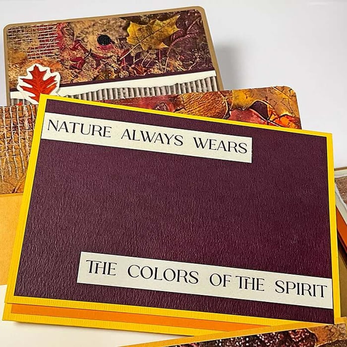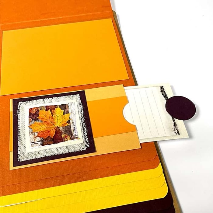 You'll construct a sweet pocket for the left inside cover. I trimmed the large sentiment cutapart strip to fit the height of the book and mat it with Plum. A journaling prompt and Leaf Charm are simple but charming (see what I did there?) embellishments for the pocket.