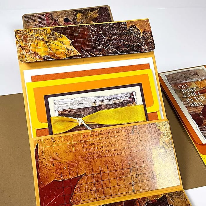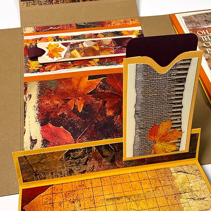 Folded booklets tuck into each pocket. I had fun decorating each booklet with mats and cutaparts trimmed to fit each element.