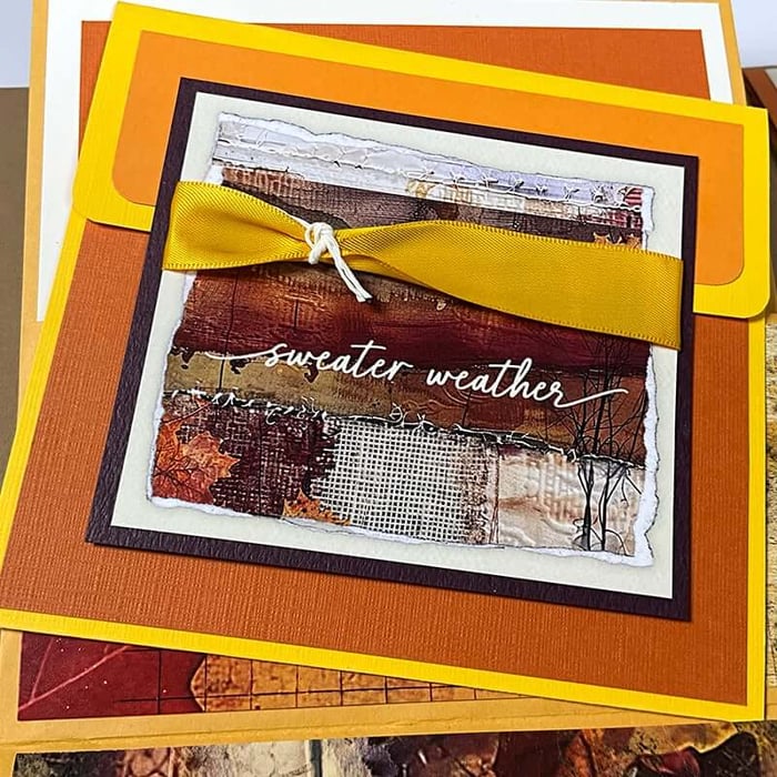 I couldn't resist adding an embellished coin envelope with a journaling prompt inside. I used the same 1" circle punch* to create the notch in the envelope and the pull tab on the cutapart. More of the linen from the deconstructed drawstring bag serves as a mat for the small leaf cutapart.