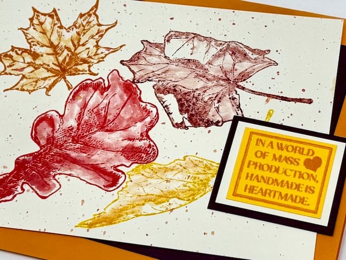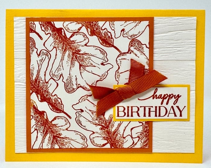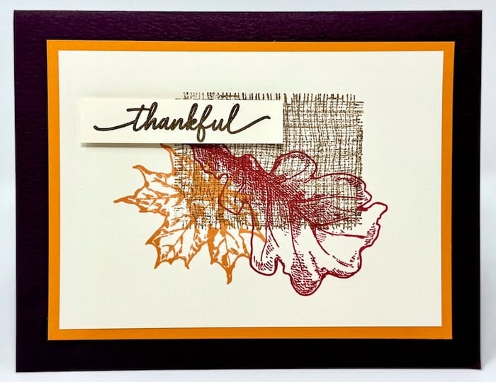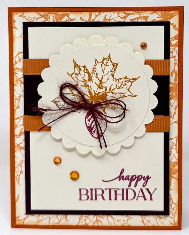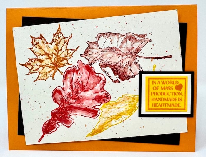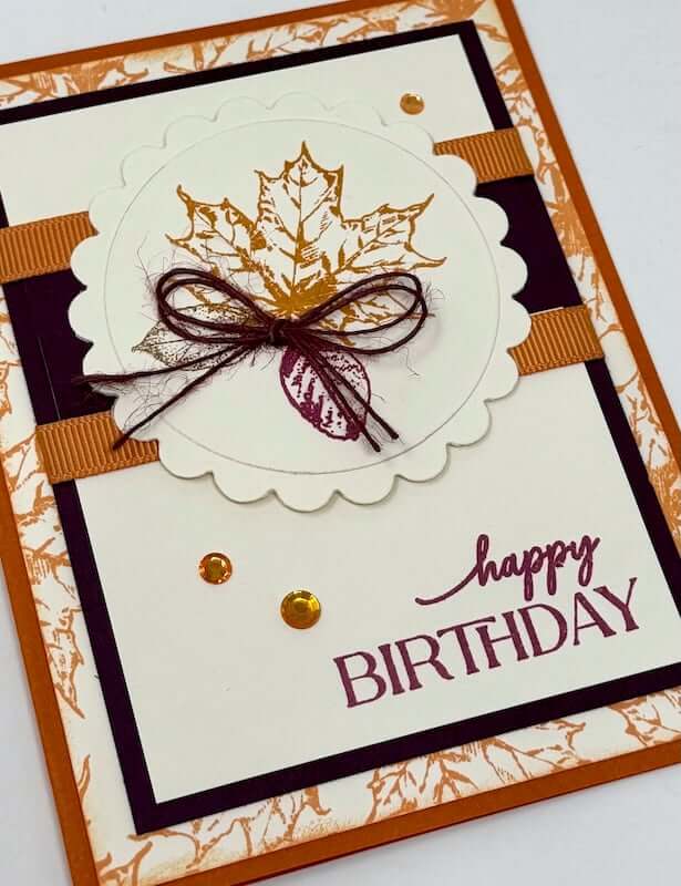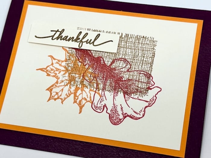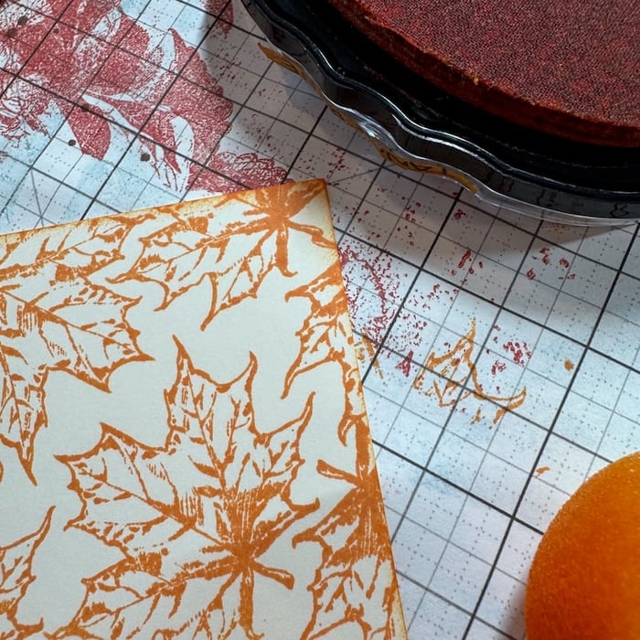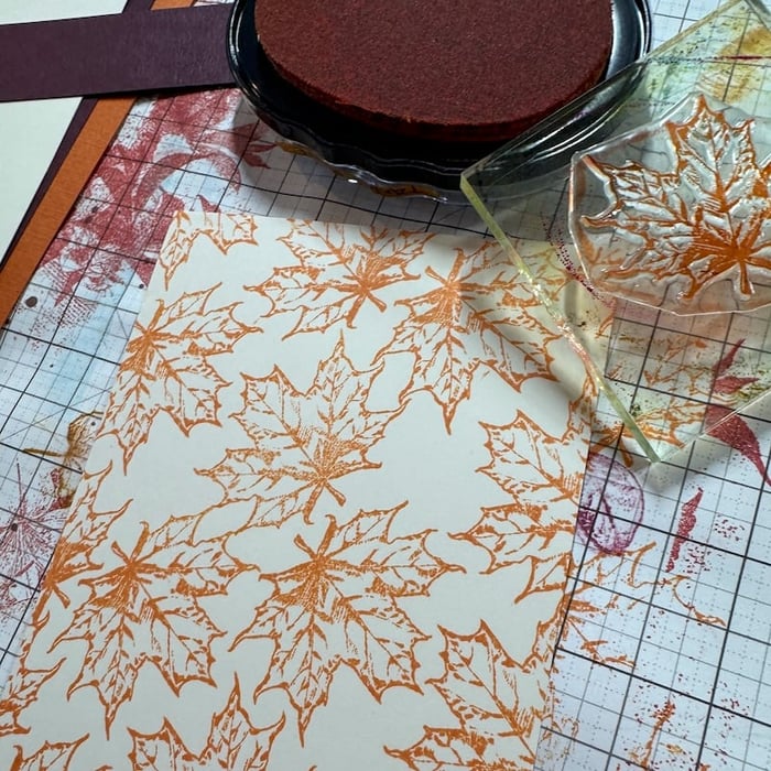 Create a custom "print" panel with maple leaf images stamped in Tangerine Ink on an Ivory Panel.