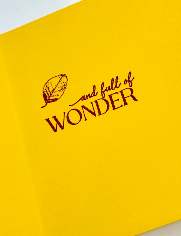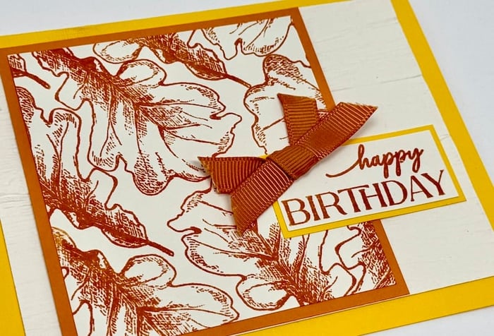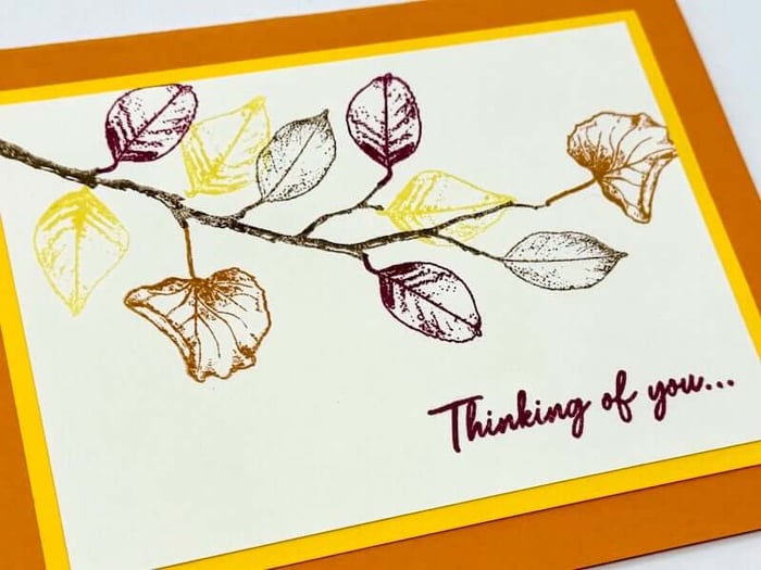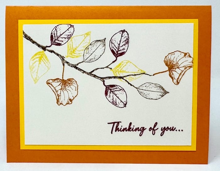 Add the small leaf and sentiment pairing in Wine Ink on the inside of the folded Yellow base to complete the card.