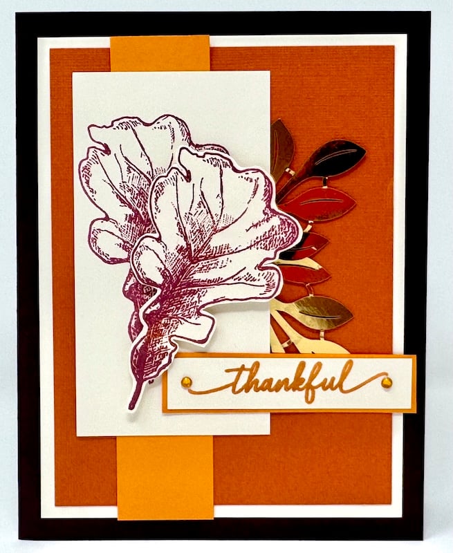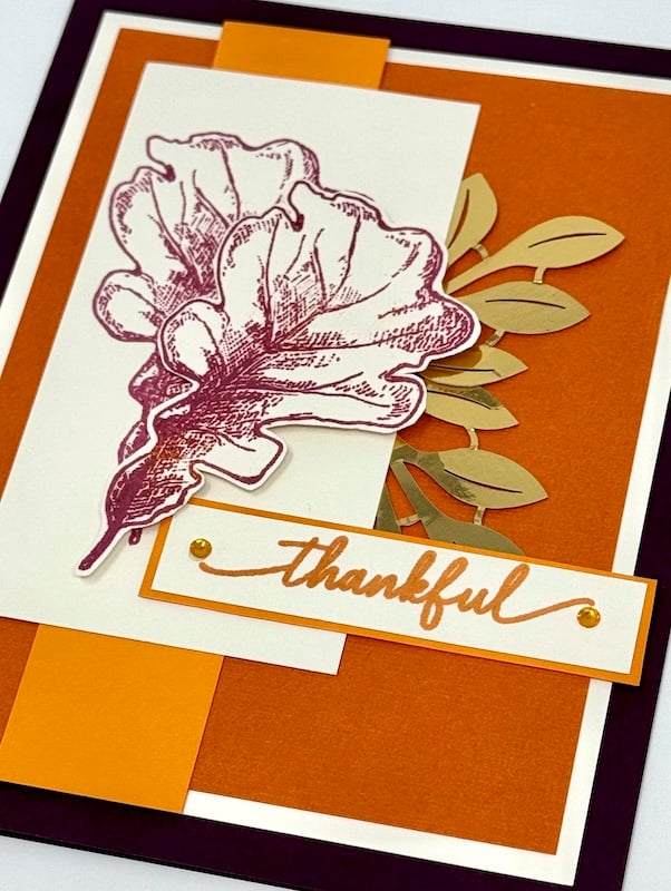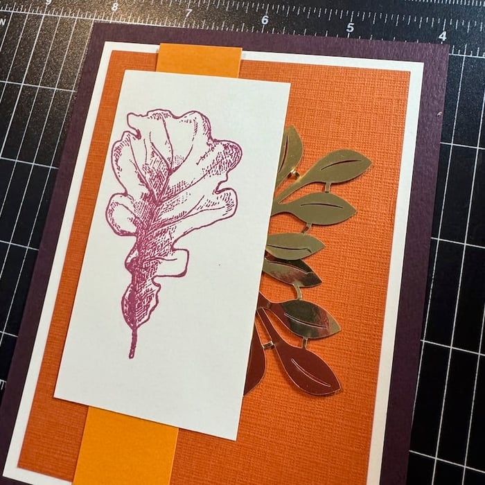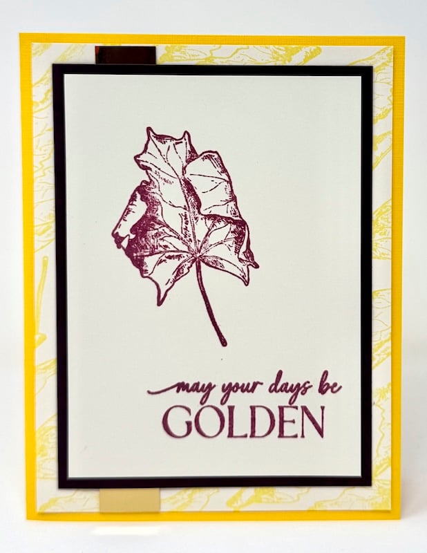 Adhere the gold strip over the yellow leaves panel aligned 1" from the left side of the paper. Layer the 3.25x4.5 stamped Ivory on a 3.5x4.75" Wine panel. Adhere over the print panel to complete the card.