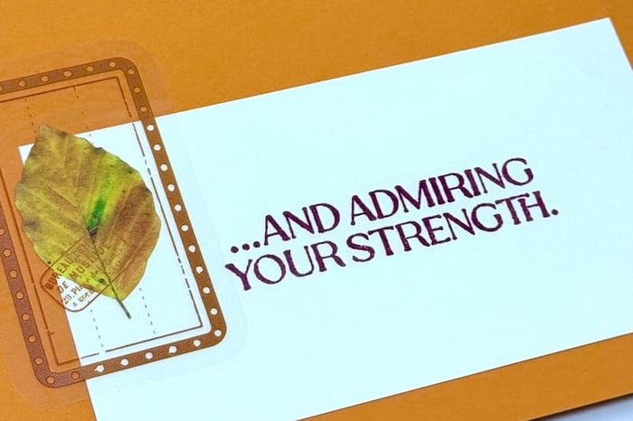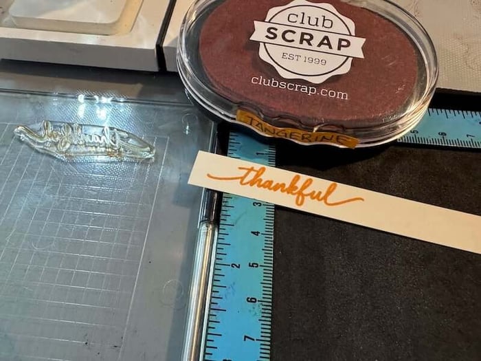 Add the sentiment to an Ivory strip in Tangerine Ink.