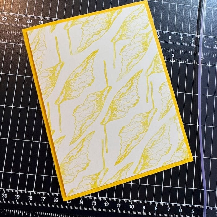 Add the thin leaf to a 4x5.25" Ivory panel in Yellow Ink. Allow the stamped images to "fall" off the edges to create a realistic all-over print. Adhere the panel to a folded Yellow card base.