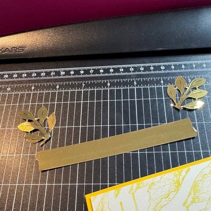 Trim the leaves from the Gold Leaf Diecuts. Set the leaves aside for use in a Card 7. Adhere the gold strip over the stamped background.