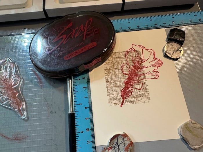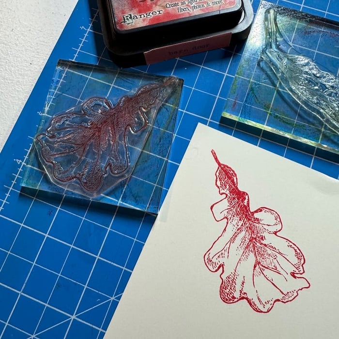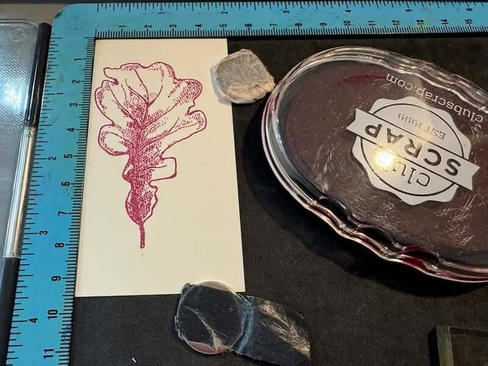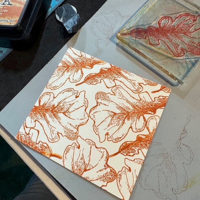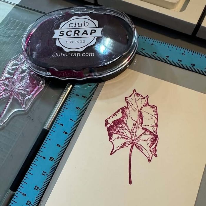 Stamp the oak leaf on an Ivory panel with Wine Ink.