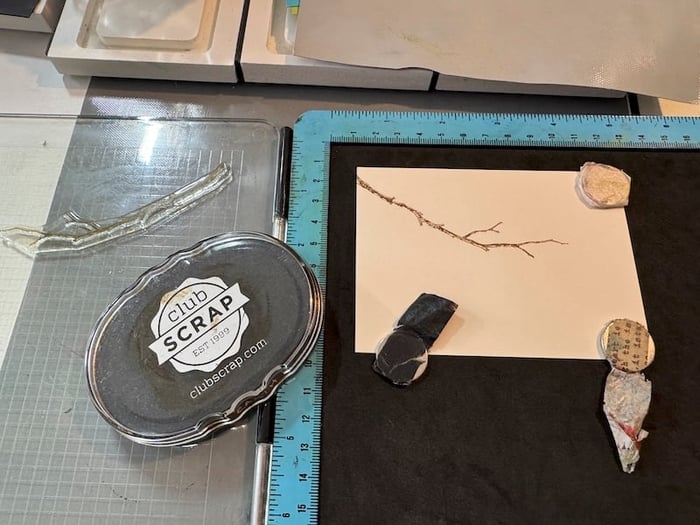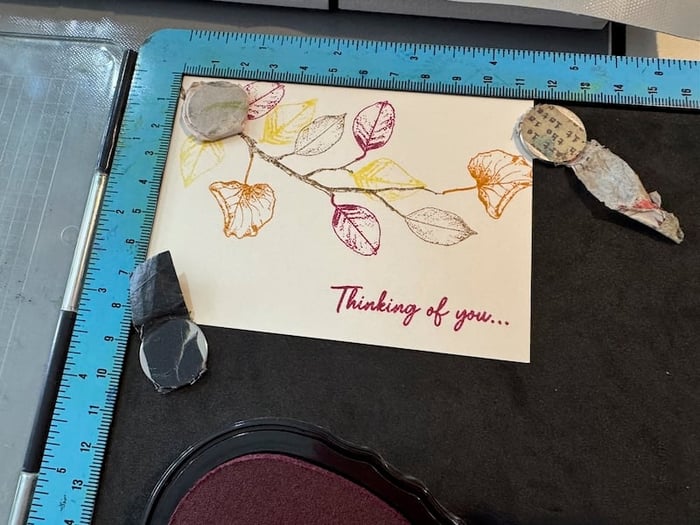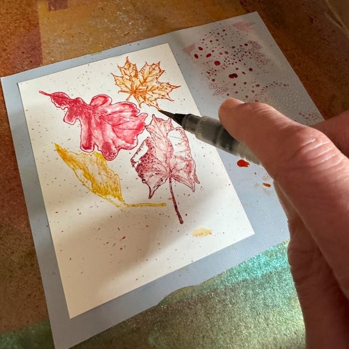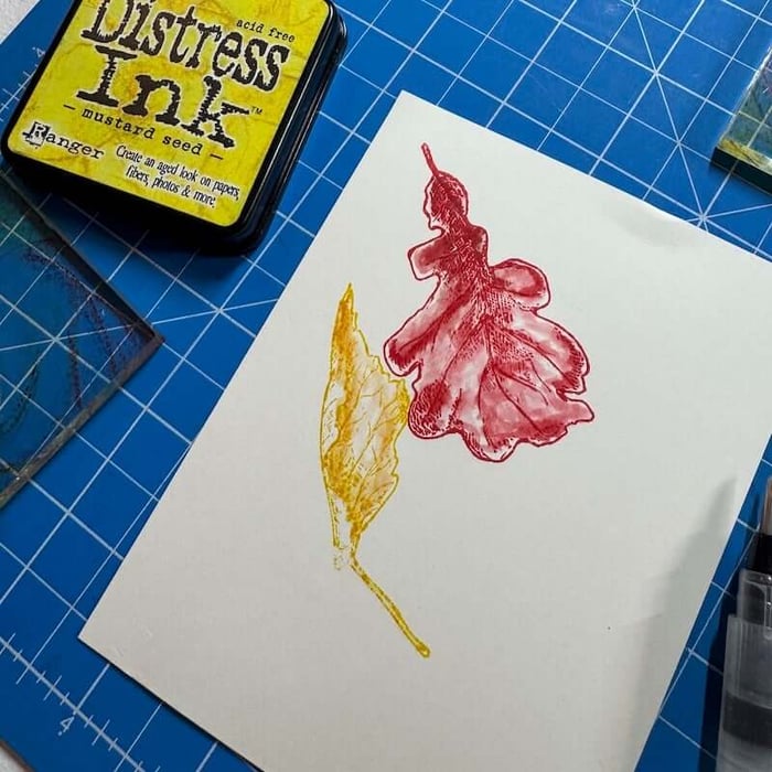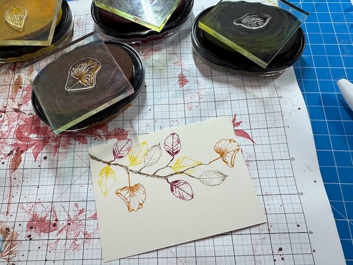 Place the panel on a cushioned surface. I use my Club Scrap Grid Paper Pad. Add several leaves to the branch in Caramel, Wine, Earth and Yellow Inks.