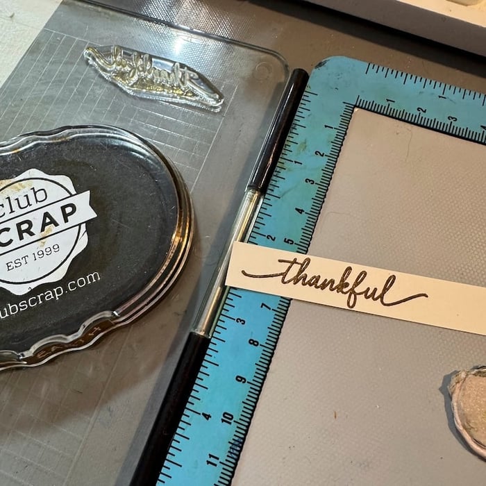 Stamp the sentiment on a small Ivory strip in Earth Ink.