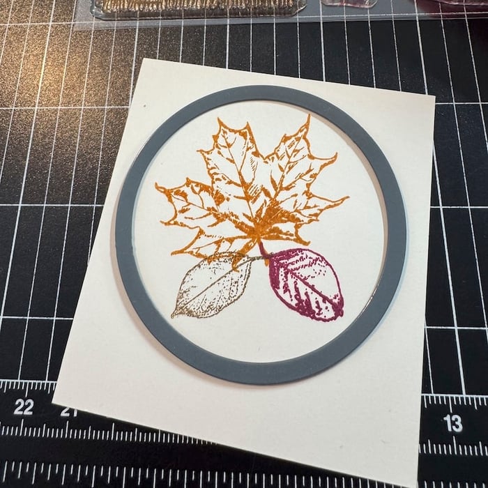 Stamp a variety of leaves in Tangerine, Earth, and Wine Ink onto a small Ivory panel and remove the images with a circle die*.