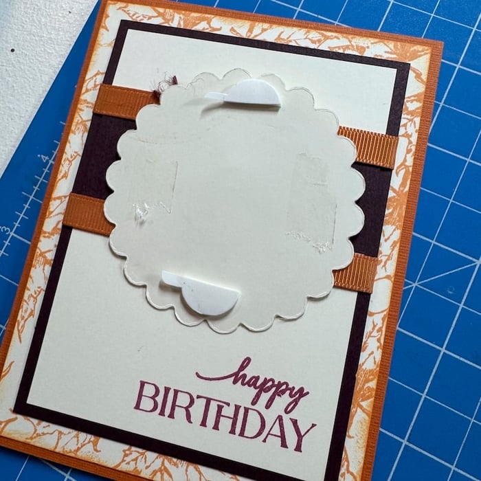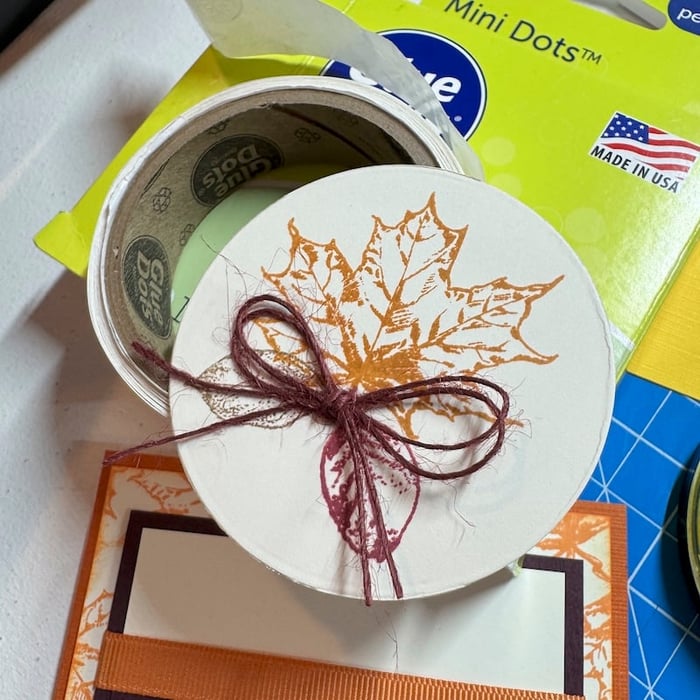 Add a Mini Glue Dot* to the center of the bow and adhere over the stamped leaves on the die cut circle. Center the stamped panel onto the scalloped circle*.
