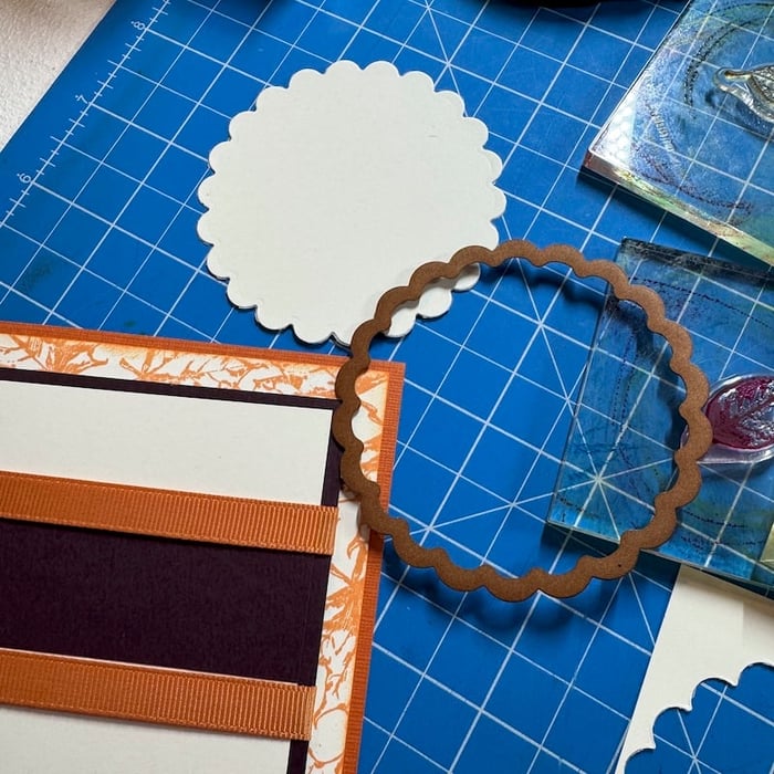 Layer the Plum panel centered on the custom "print" leaves panel. Cut a scalloped circle* from a piece of Ivory paper to create a mat for the panel.