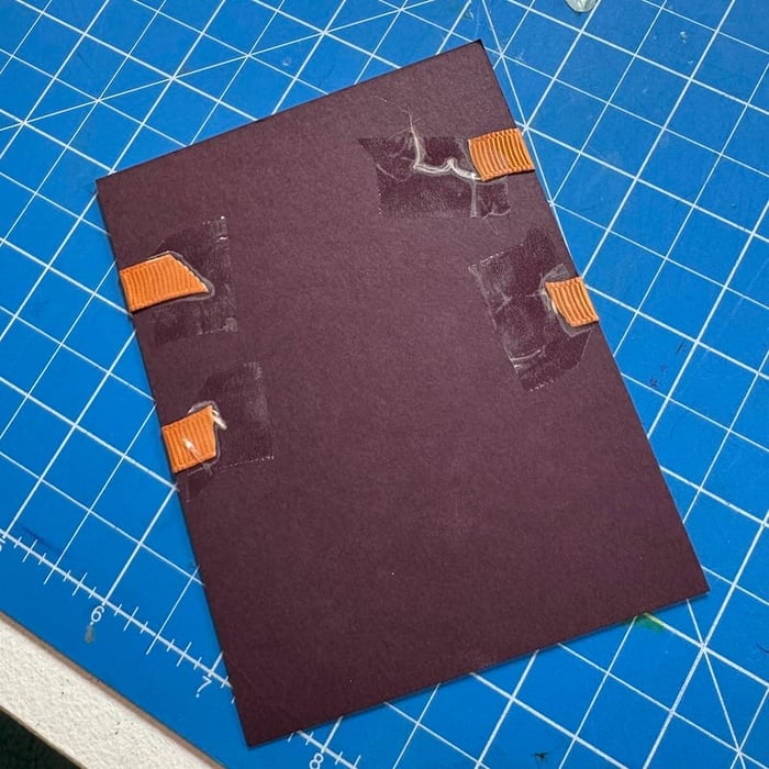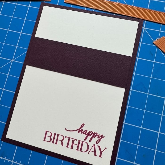 Trim two 5" lengths of orange grosgrain ribbon. Position them on either side of the Plum strip and wrap the ends to the back of the Plum panel. Secure on the back with clear tape.