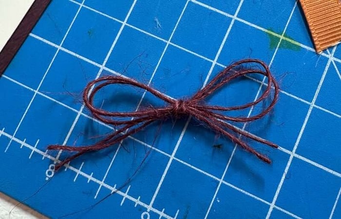 Stamp the sentiment in Rusty Hinge Distress Ink on an Ivory strip. Layer with a Yellow mat. Tie a loose knot in a piece of orange grosgrain ribbon. Slide a smaller piece of the same ribbon through the opening in the knot and tighten to secure.