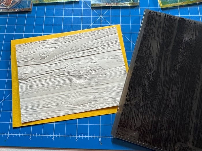 Add wood grain texture to a 3.75x5" Ivory panel with a 3D embossing folder.