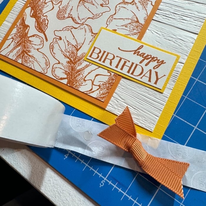 Adhere the ribbon with a Mini Glue Dot* over the sentiment to complete the card.