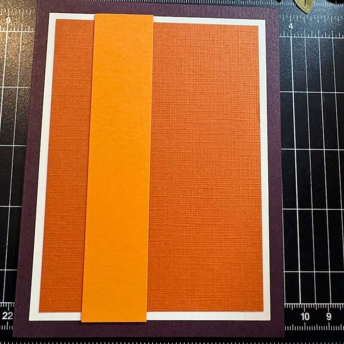 Layer a 3.5x4.75 Dk. Orange panel on a 3.75x5" Ivory paper. Adhere a 1x5" Lt. Orange strip vertically on the layered panels.