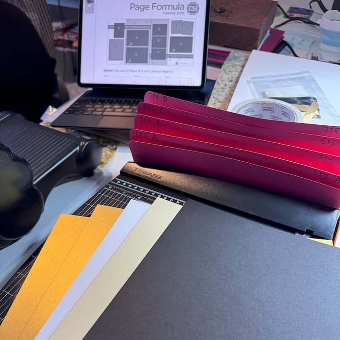 Cut and sort the 12x12" papers: White (Paper A), Custom Cream Speckle "Print" (Paper B), and Black (Paper C) with a paper trimmer*.