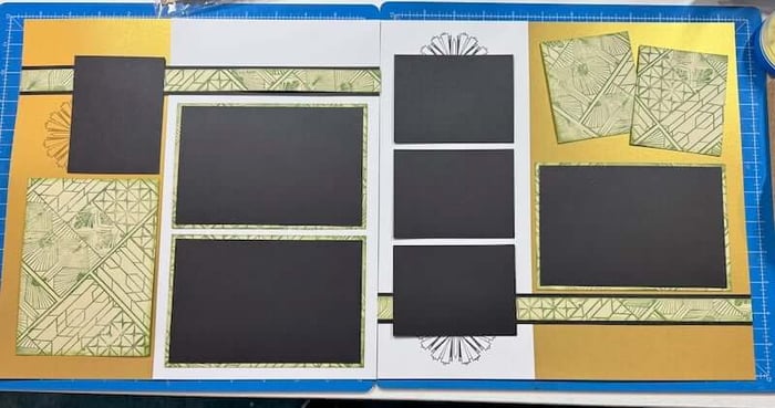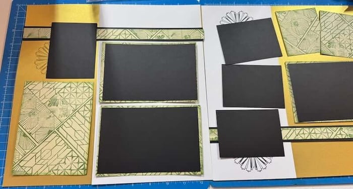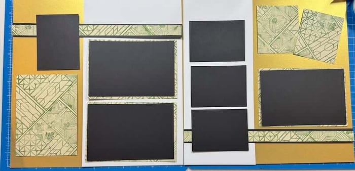 Return the Gold base paper back to it's position on the left side of layout. The fan images should be peeking out from behind each small Black panel on both sides of the layout.