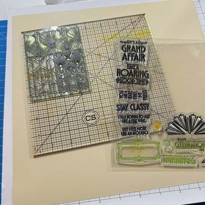 Separate the Cream Speckle (Paper B) from the stack and place it onto a padded work surface. (I use my Club Scrap grid paper pad.) Select the large collage image from the stamp set and mount it on an 8x8" Grid Ruler.