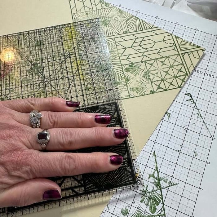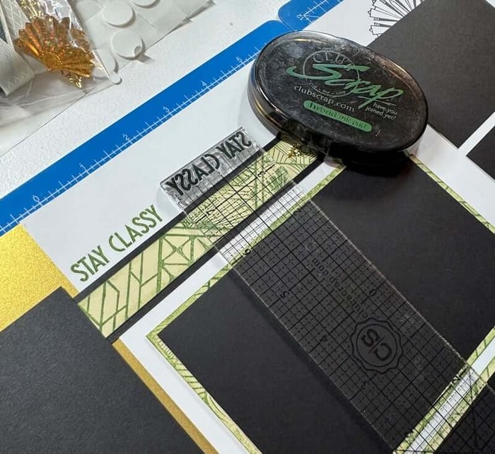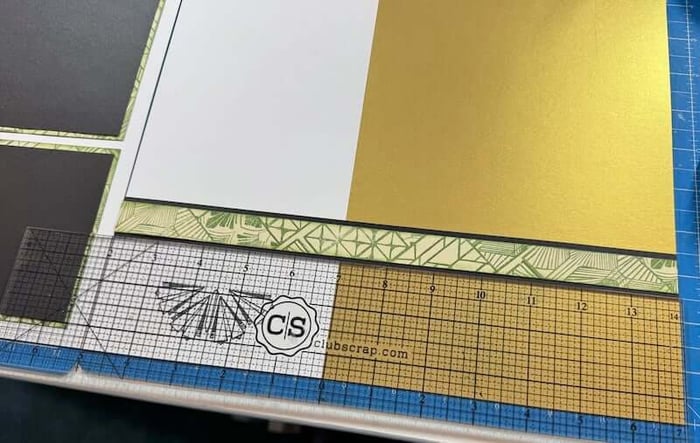 Position the border strips with the help of a 3x14" acrylic ruler. Adhere to the background papers.