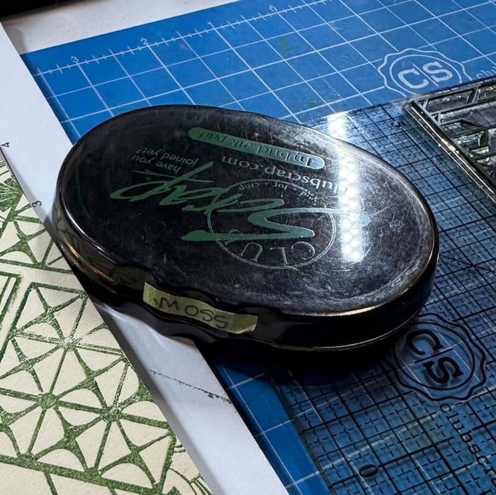 Add a small sentiment to an acrylic ruler. Stamp the image above the "print" border strip on the left page with Moss Ink.