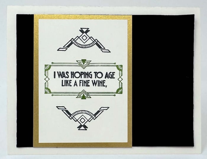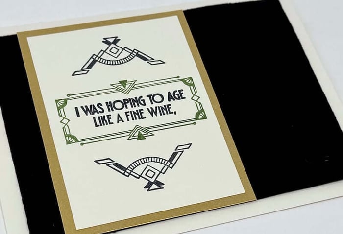 Adhere a 3-3/4x5 Black to a 4x5-1/4" Gold panel. Center the double mats onto a folded Cream Speckled card base.