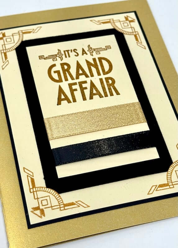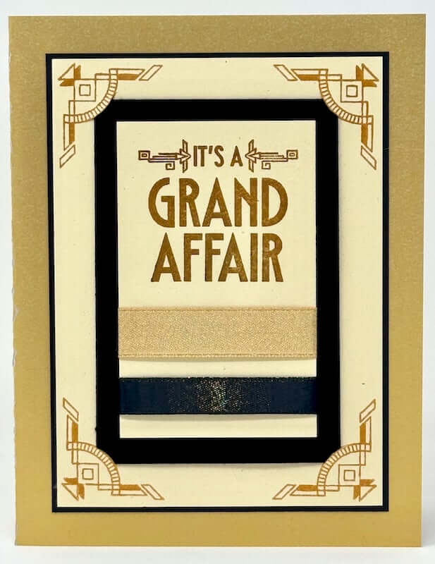Wrap the ends of the Gold and Black ribbons around the back of the panel and secure with clear tape. Nest onto a 2-3/4x4" Black panel.