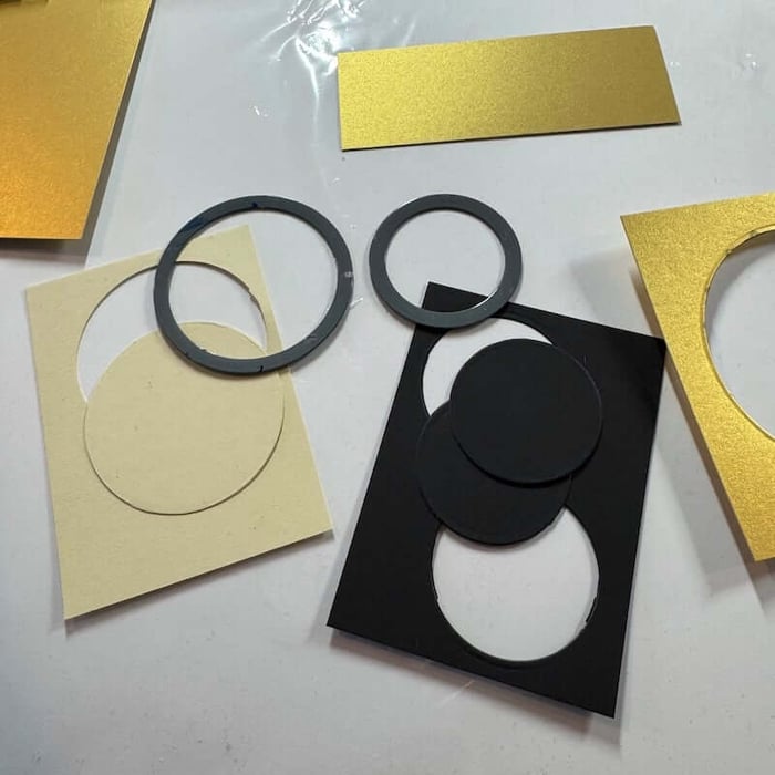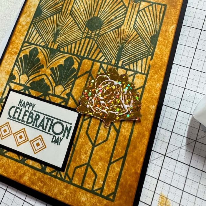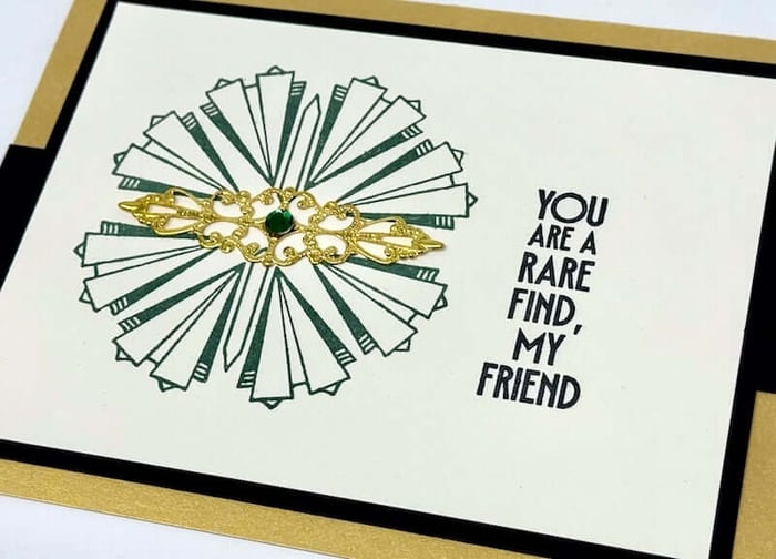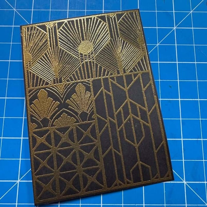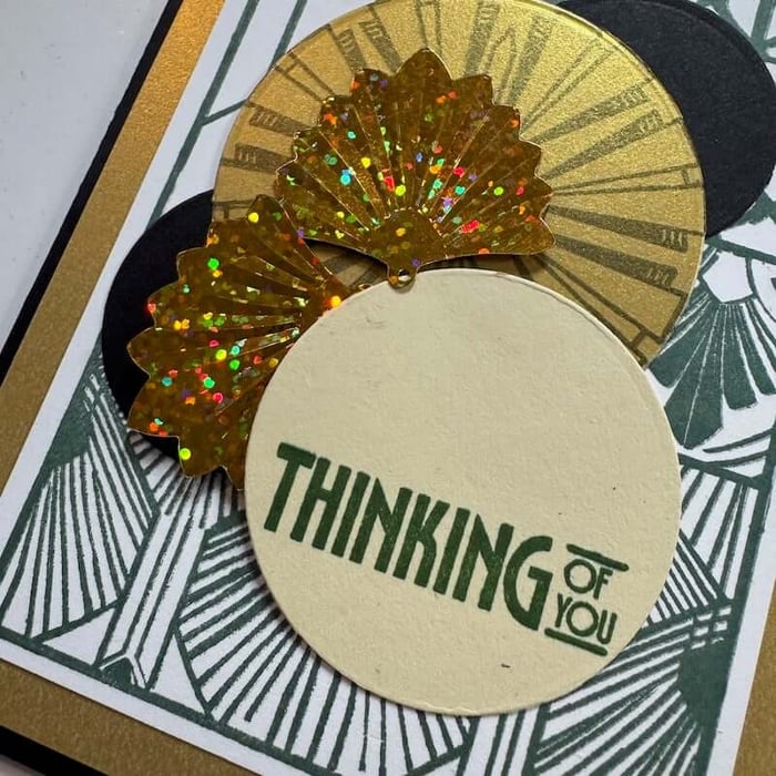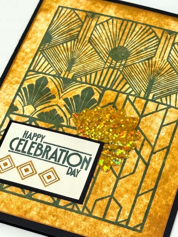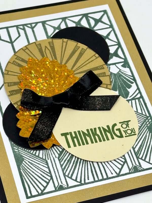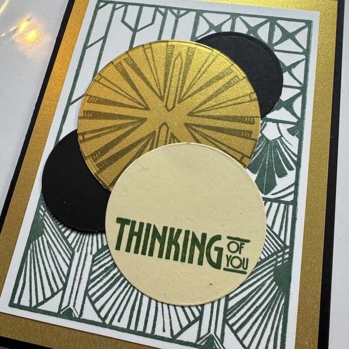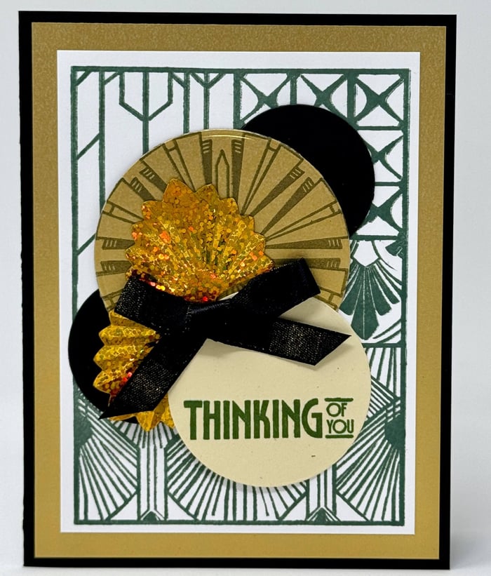 Center the stamped panel onto a 4x5-1/4" Gold mat; adhere to a folded Black card base. Add the remaining circle panels as shown.