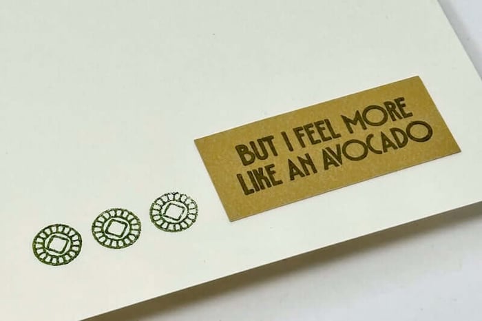 For the inside of the card, stamp the companion sentiment onto a small piece of Gold paper with India Black Ink. Stamp three circles with Moss Ink.