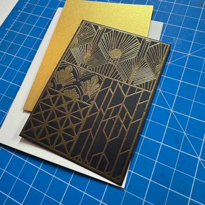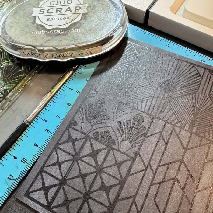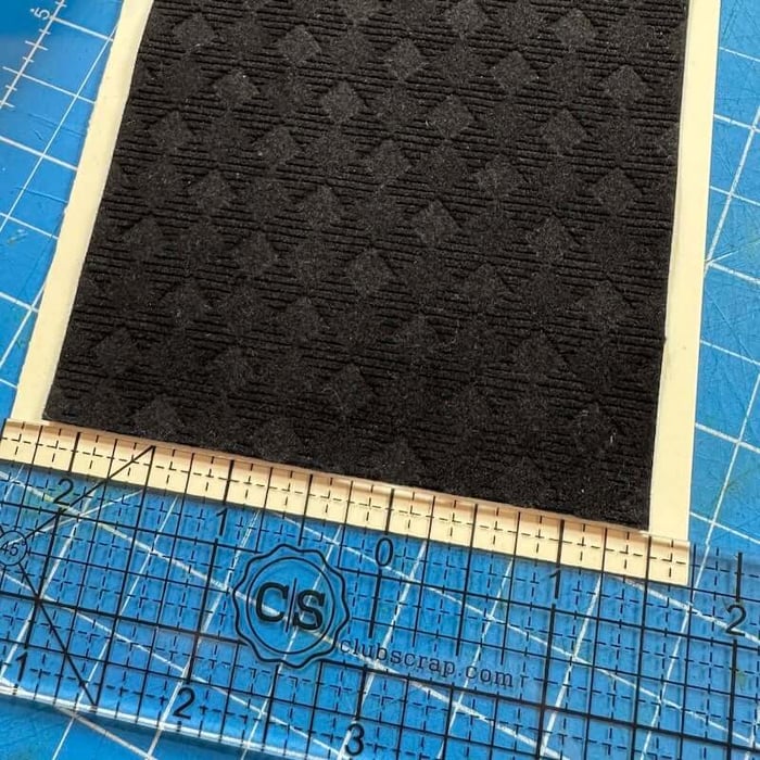 Adhere the embossed mat to an Ivory folded card base using a Grid ruler as a guide.