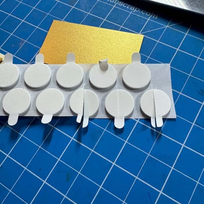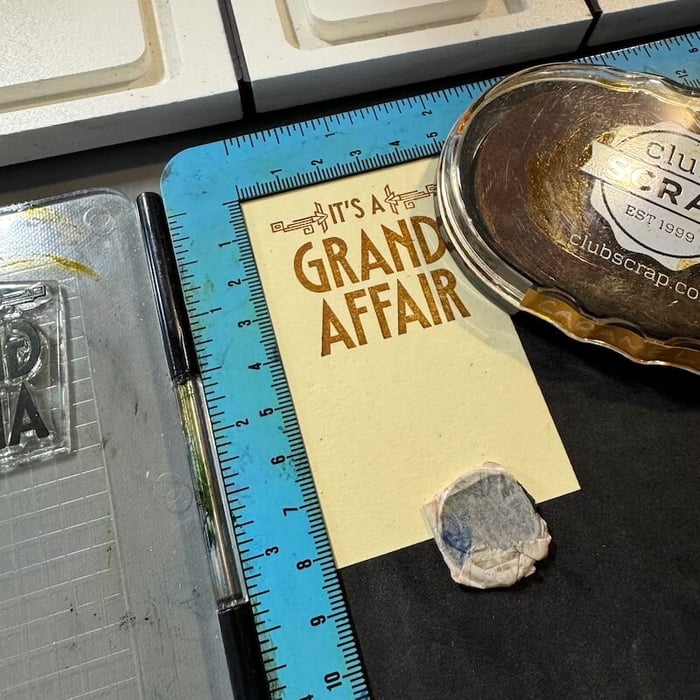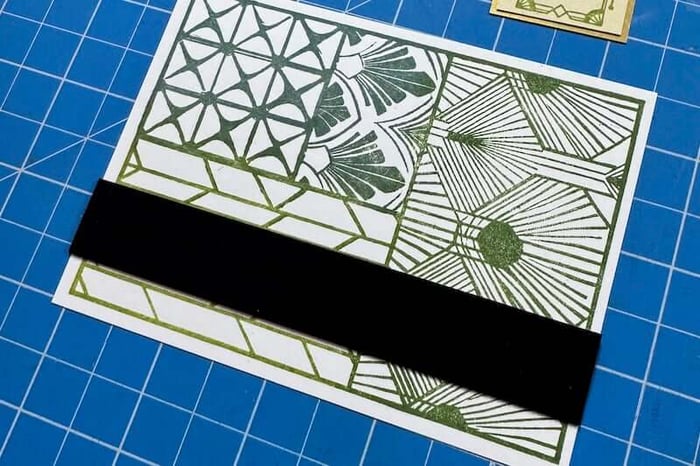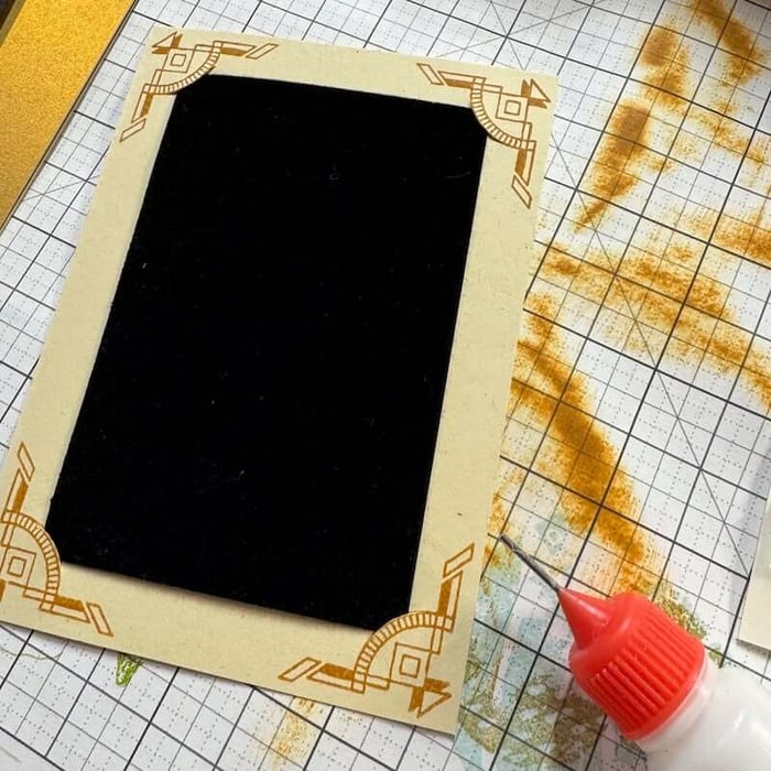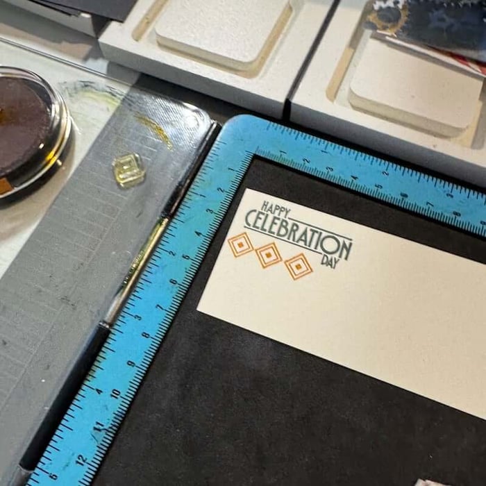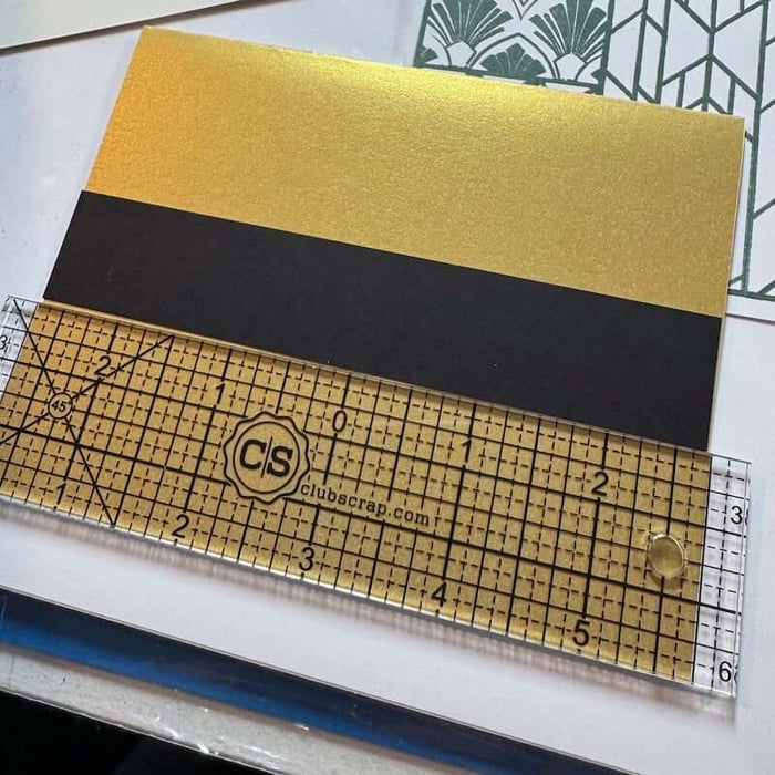 Adhere a 1x5-1/4" Black strip to a Gold folded card base using a mini grid ruler to ensure perfect alignment.