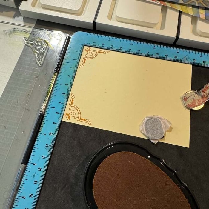 Stamp the corner images onto a 3-1/2x4-3/4" Cream Speckled panel with Caramel Ink.