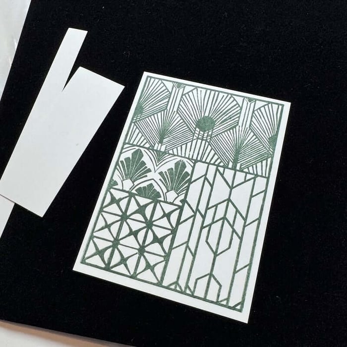 Add two fan images to the left side of a 3-1/2x4-3/4" Ivory panel with Moss Ink.