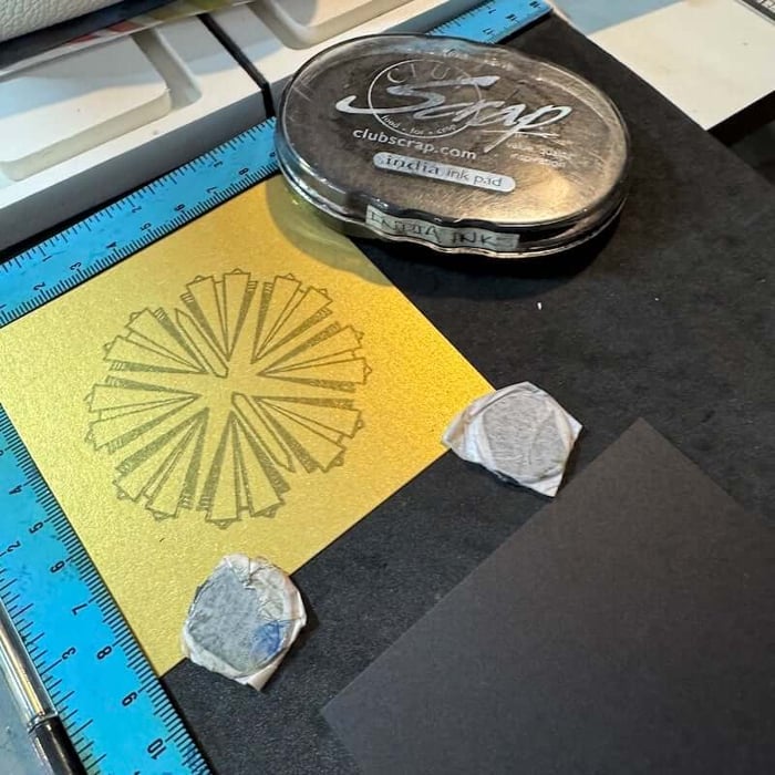 Stamp the two fan shapes onto a Gold panel with India Ink.