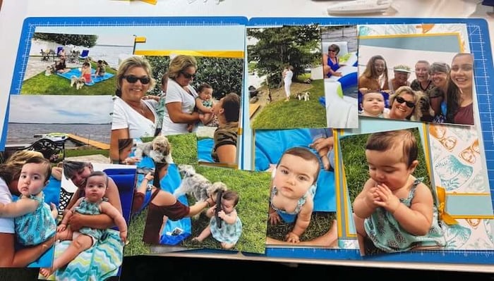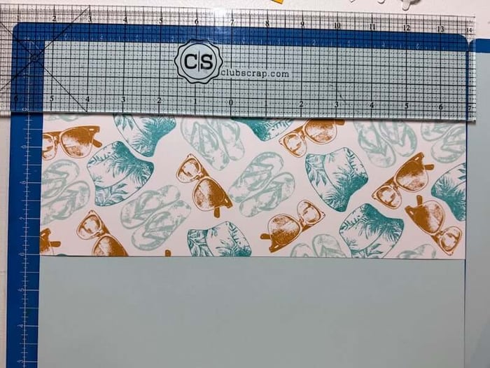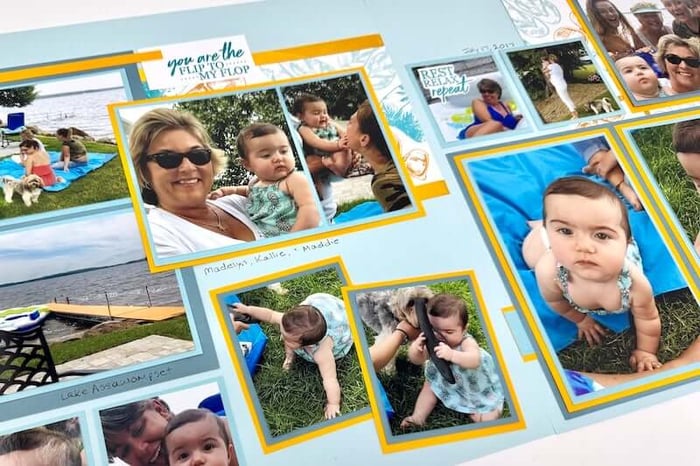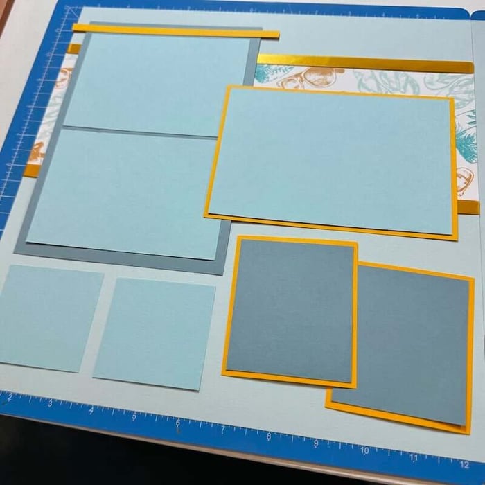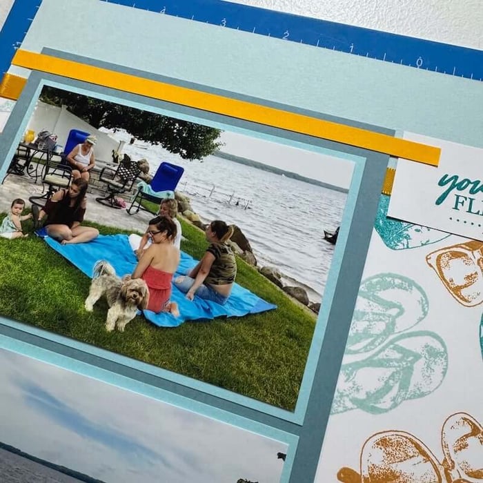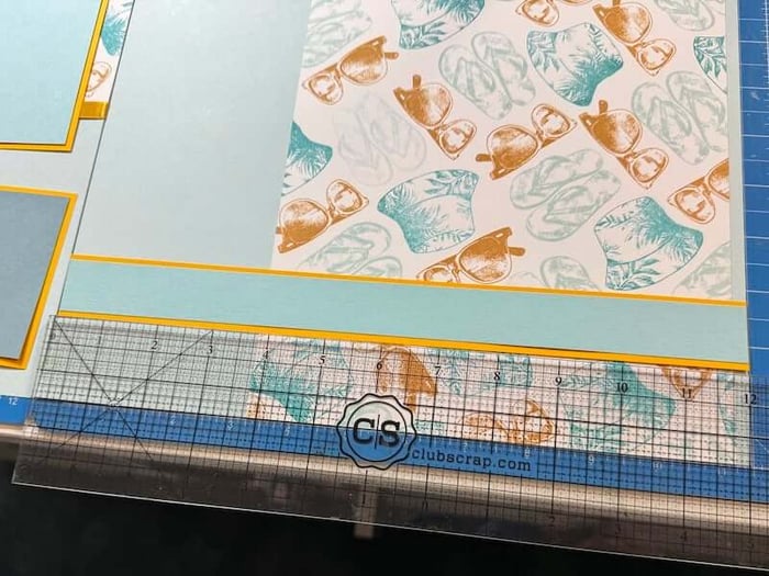 For the right side of the layout, adhere the large custom print to the Lt. Blue base paper. Position the border strips with the help of a 3x14" acrylic ruler.