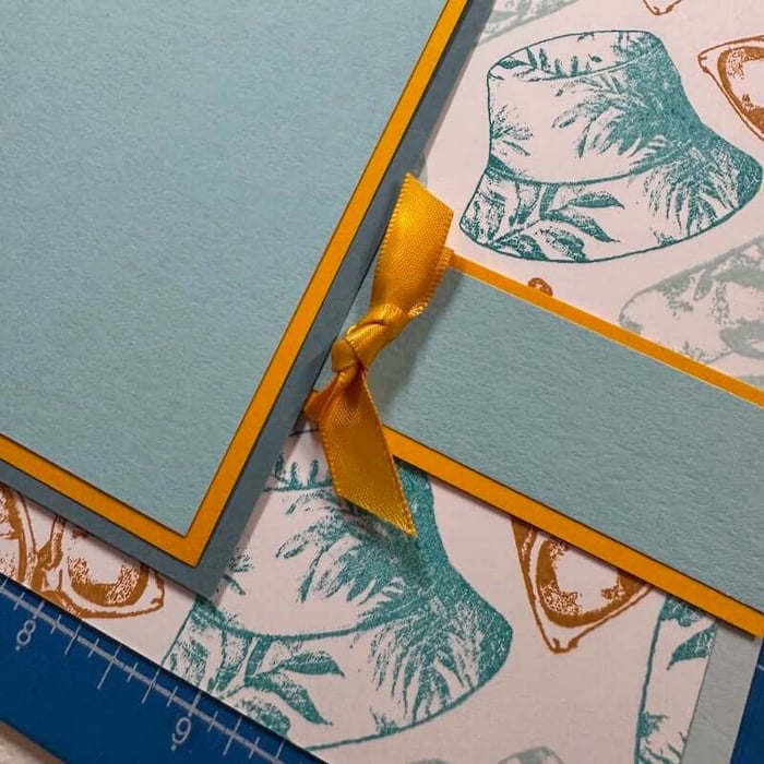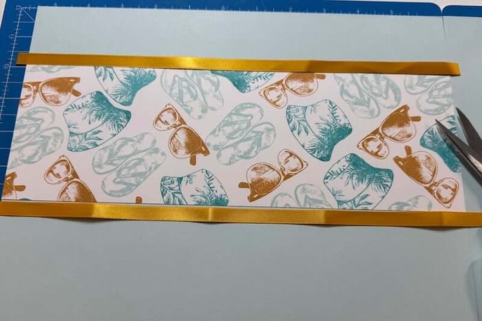 Trim two lengths of Gold ribbon slightly longer than the width of the 12x12" Lt. Blue base paper.