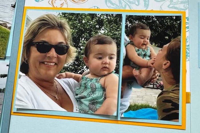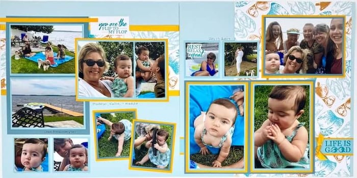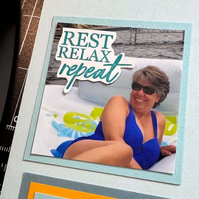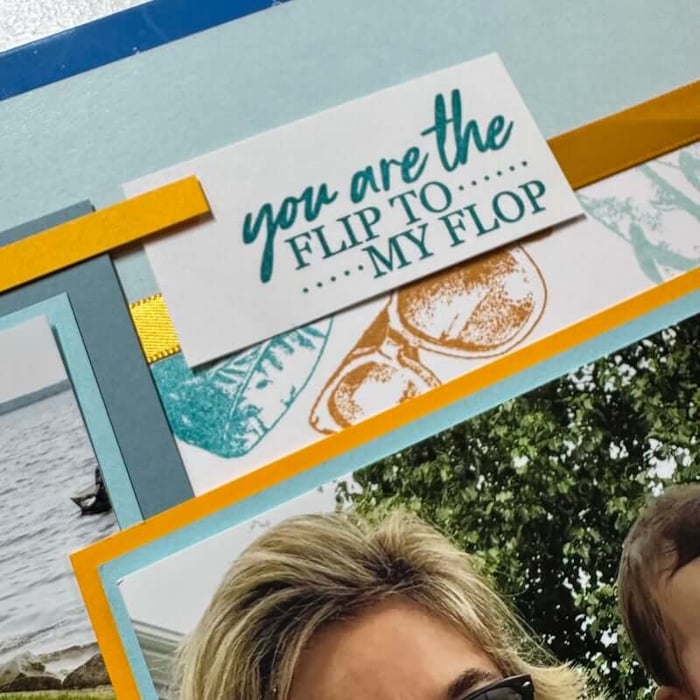 Trim and position the sentiment above the photo mats at the top of the Left page.