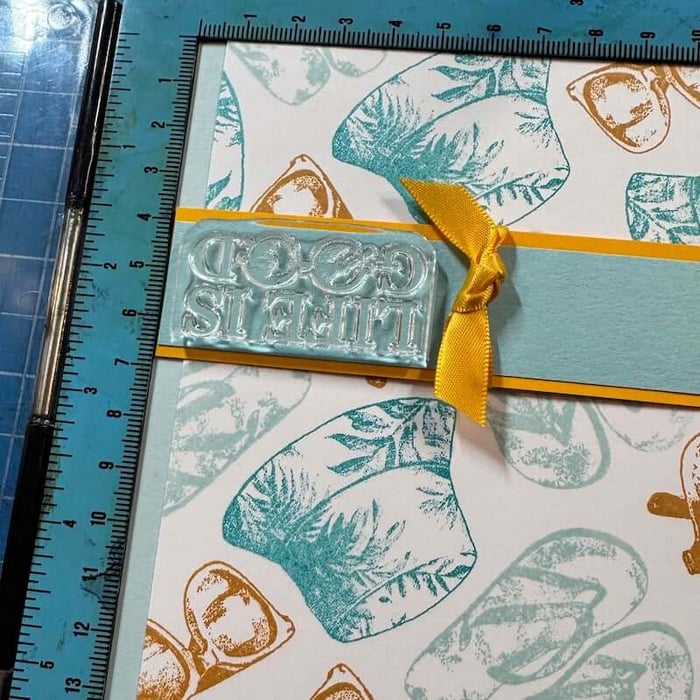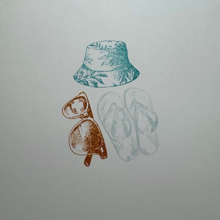 Separate the White (Paper B) from the stack and place it onto a padded work surface. (I use my Club Scrap grid paper pad.) Select the flip flops, hat, and sunglasses from the stamp set and mount them onto small acrylic blocks.