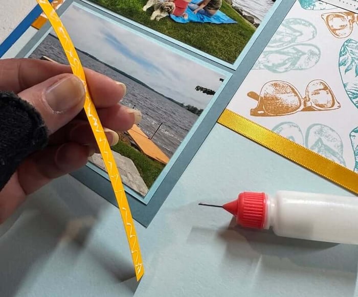 Temporarily place the photo mats onto the page. Wrap a small piece of Gold ribbon around the strip next to the photo mat and secure with a knot.