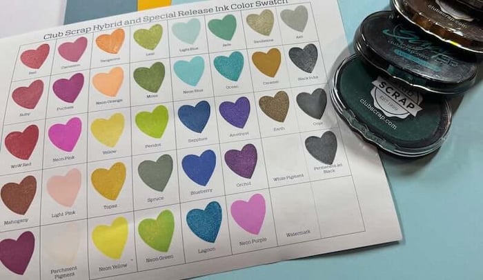 A Club Scrap Ink color swatch helps me find a perfect ink color to coordinate with the collection; in this case, Ocean, Lt. Blue and Caramel CS® Hybrid inks.