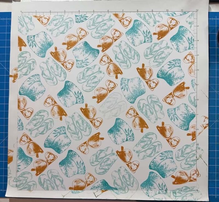 Designate one ink color for each image. Stamp the images to fill the 12x12 White paper to create a custom print. Continue adding images rotating each in alternating directions.